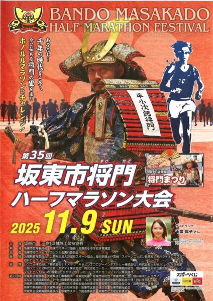 坂東市は茨城県西南部、関東平野のほぼ中央に位置し、自然環境に恵まれた田園地帯となっています。市内には平安時代に関八州を制した平将門公ゆかりの史跡も数多く残されており、自然と歴史が共存する坂東市で、開催される「坂東市将門ハーフマラソン大会」は今年で第35回を迎えます。