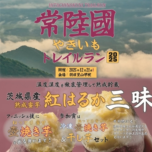 フィニッシュ後には壺焼き芋がふるまわれ、参加賞として冷凍壺焼き芋と干し芋セットがもらえる、茨城県産熟成蜜芋「紅はるか」三昧のトレイルラン。