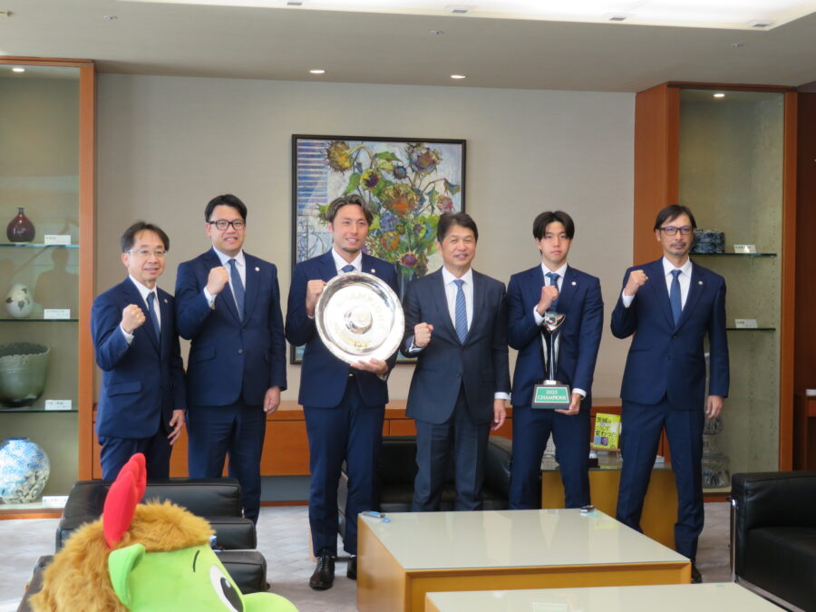 大井川知事は「優勝でJ1に昇格され、周囲の期待と注目度が上がると思う。大変だと思うがこれからがスタート、ぜひ頑張っていただきたい。」と激励しました。