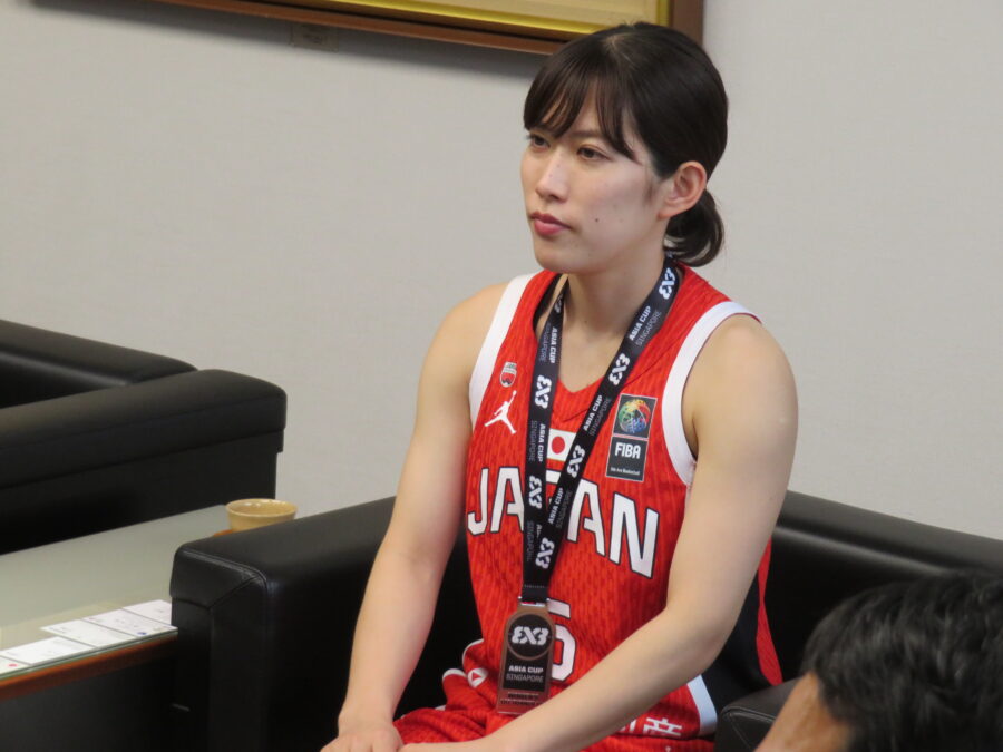 3月26日(水)から30日(日)にかけて、シンガポールで行われた「FIBA3×3 Asia Cup 2025」に日本代表選手として出場し、準優勝の栄冠を勝ち取った 鶴見 彩 選手が結果報告のため、4月8日(火)に岩下副知事を表敬訪問しました。