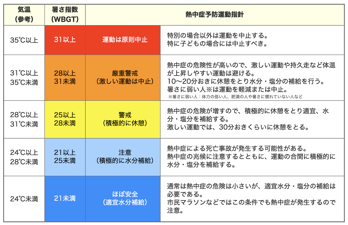 また、同協会発行の「スポーツ活動中の熱中症予防ガイドブック」において、スポーツ時の熱中症を予防するための指針も次の通り示されています。